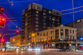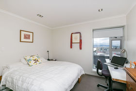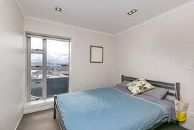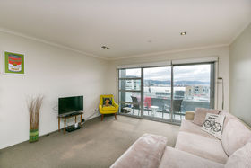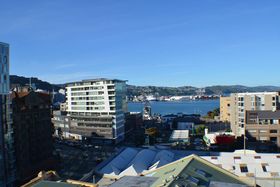 This modern apartment on the ninth floor has views across the city to the harbour and Hutt Valley.