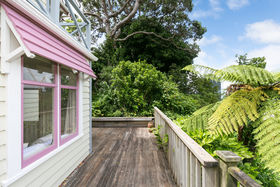 Deck area for alfresco dining at front of house, small deck off dining area and bonus of another deck on lower level with peaceful leafy outlook towards Bowen Street, glimpses of Wellington harbour and distant hills.