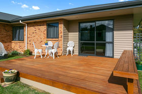 As durable as it is beautiful in solid brick folding around a well-spec'd kitchen and open-plan living where ranch sliders afford easy connection to super-sunny decking.