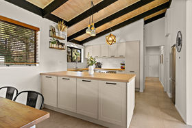 -Open-plan living with sarked ceilings, a woodburner, a modern kitchen, dining and an office nook.